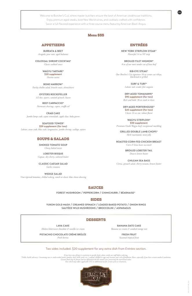 MSC has moved to a flat-fee model for Butcher’s Cut, priced at $55 per guest for a three-course meal that includes one starter, one entrée with two sides, and one dessert. Optional supplements are available for premium dishes like dry-aged tomahawk, wagyu striploin, and seafood towers.