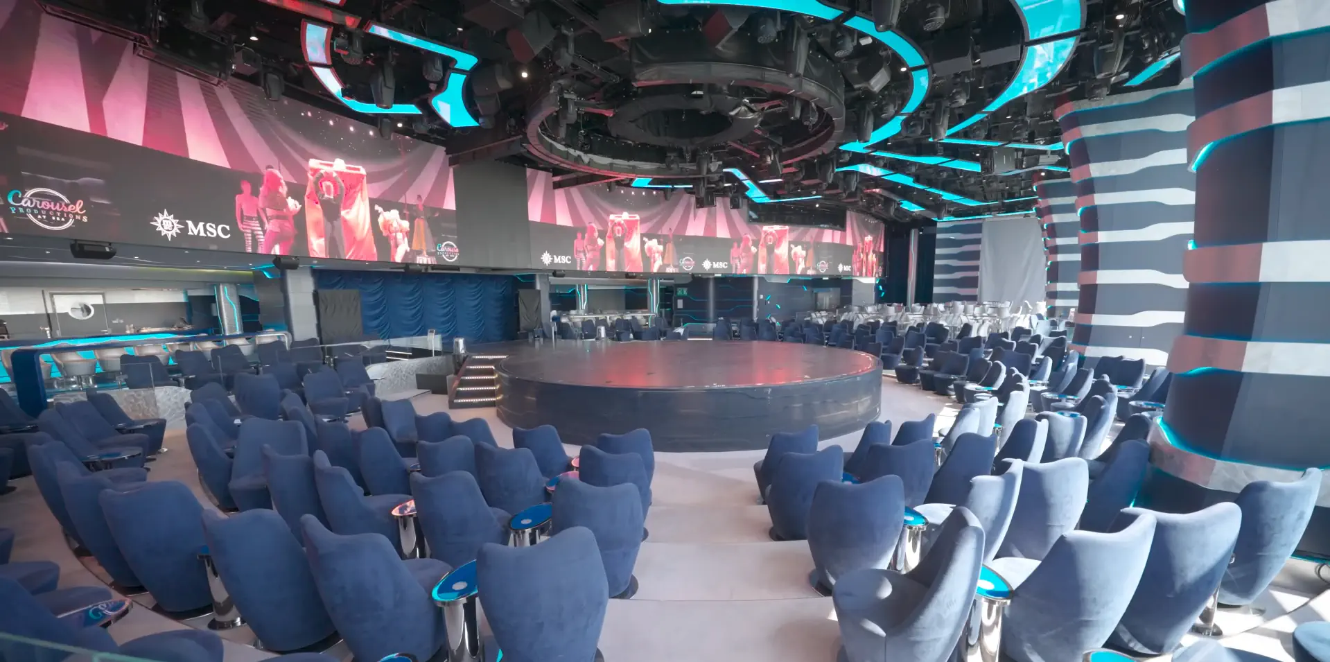 While the MSC Euribia has a venue named the Carousel Lounge in the same location, it is a more traditional cruise ship lounge. It carries the Carousel Lounge name but does not use the same circular stage design or the specialized performance infrastructure found in the original Meraviglia Class. Euribia hosts a different set of shows that do not follow the classic Carousel Productions at Sea staging.
