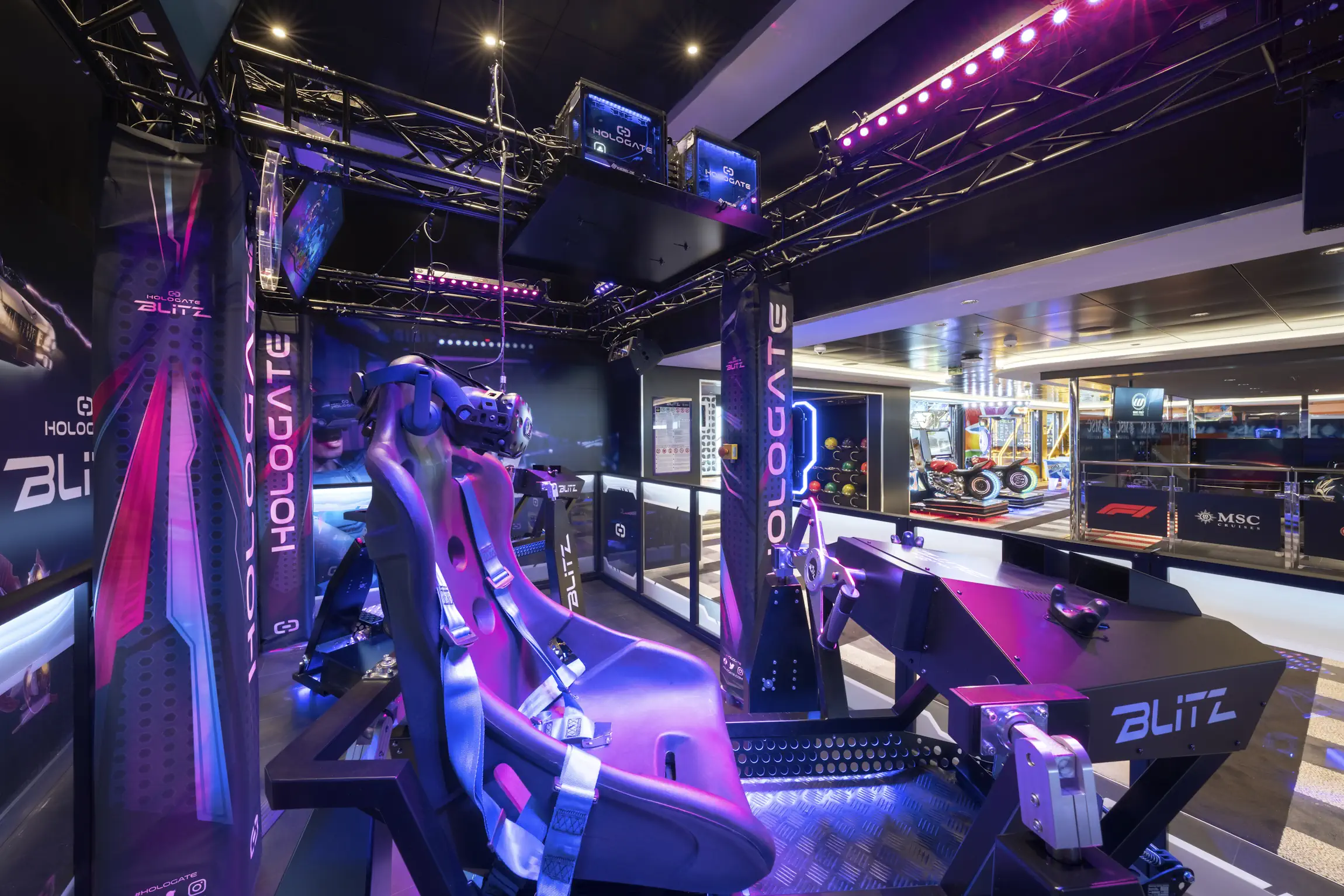 MSC sells a Fun Pass package specifically for its amusement attractions, and the company lists items like video games, Formula Racer, bowling, XD/4D cinema, VR games, and on some ships flight simulator as part of that entertainment bundle.