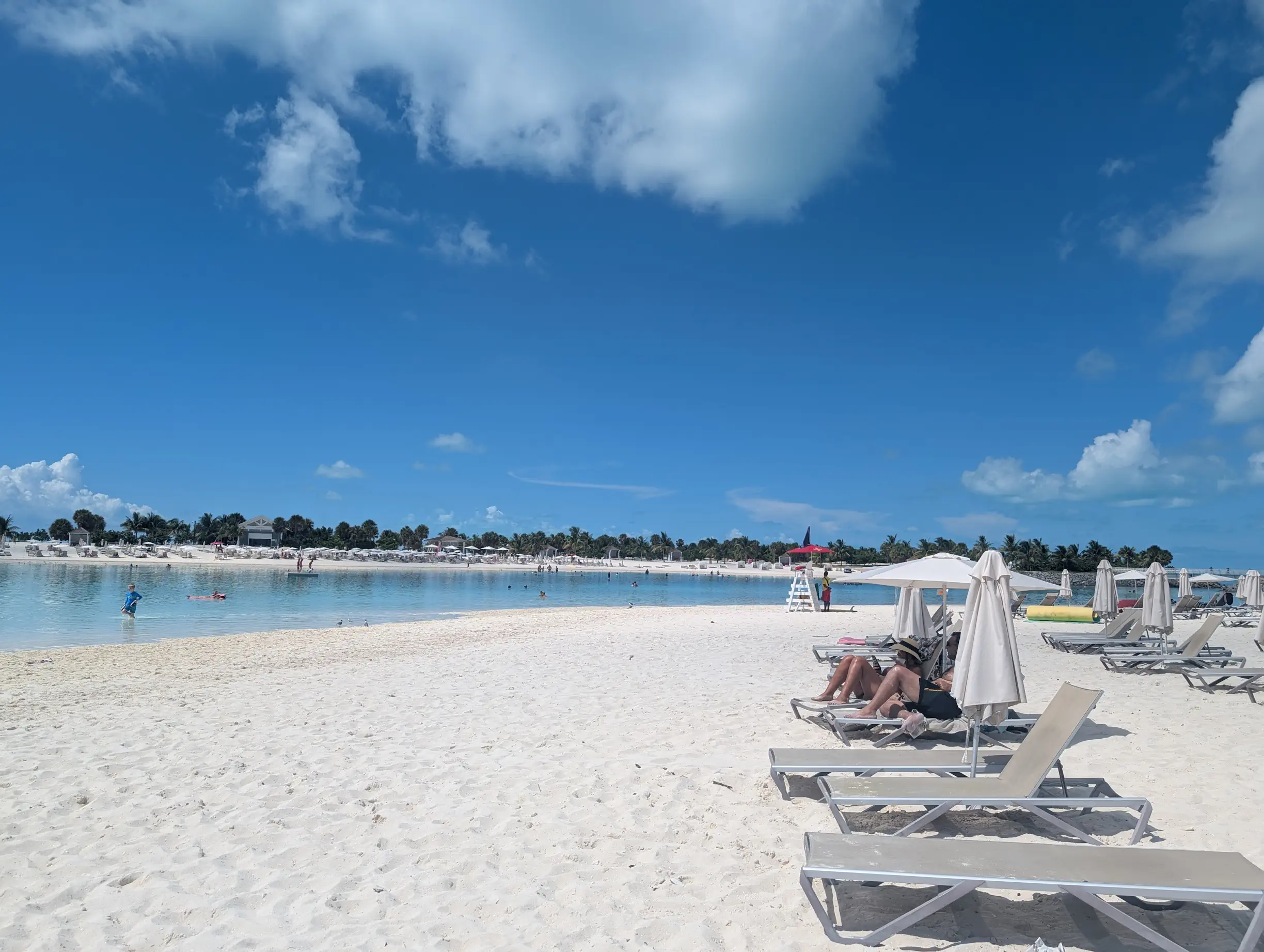 Outside of umbrella areas, shade on the island is limited. Free loungers are available, but shaded ones can fill up quickly, especially on warm, sunny days.
