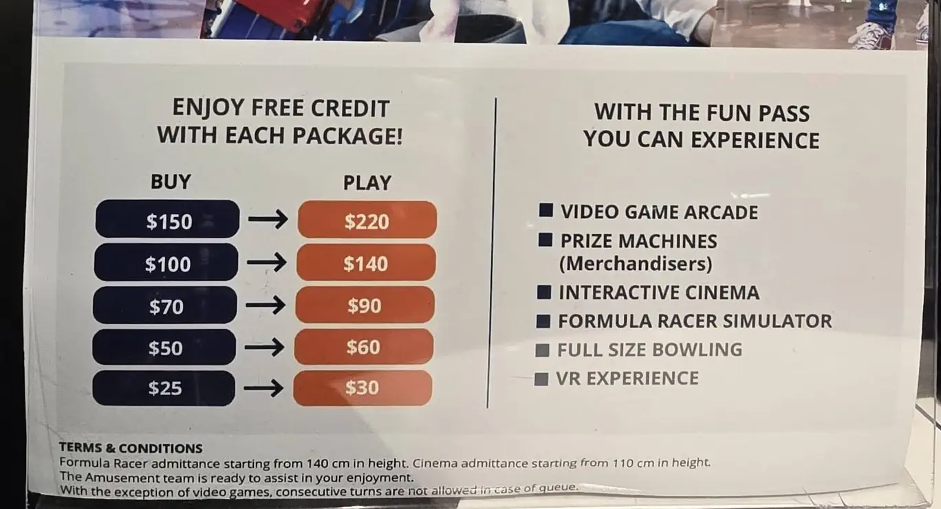 If you plan on doing the F1 simulator, VR, cinemas, and maybe bowling, the prepaid credit model usually looks better than paying each one individually.
